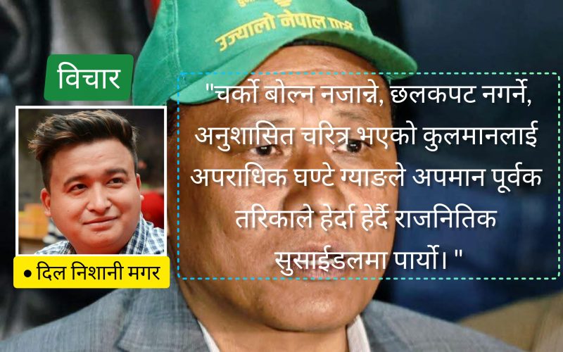 चर्को बोल्न नजान्ने, छलकपट नगर्ने, अनुशासित चरित्र भएको कुलमानलाई अपराधिक घण्टे ग्याङले अपमानपूर्वक तरिकाले हेर्दा हेर्दै राजनितिक सुसाईडलमा पार्यो।
